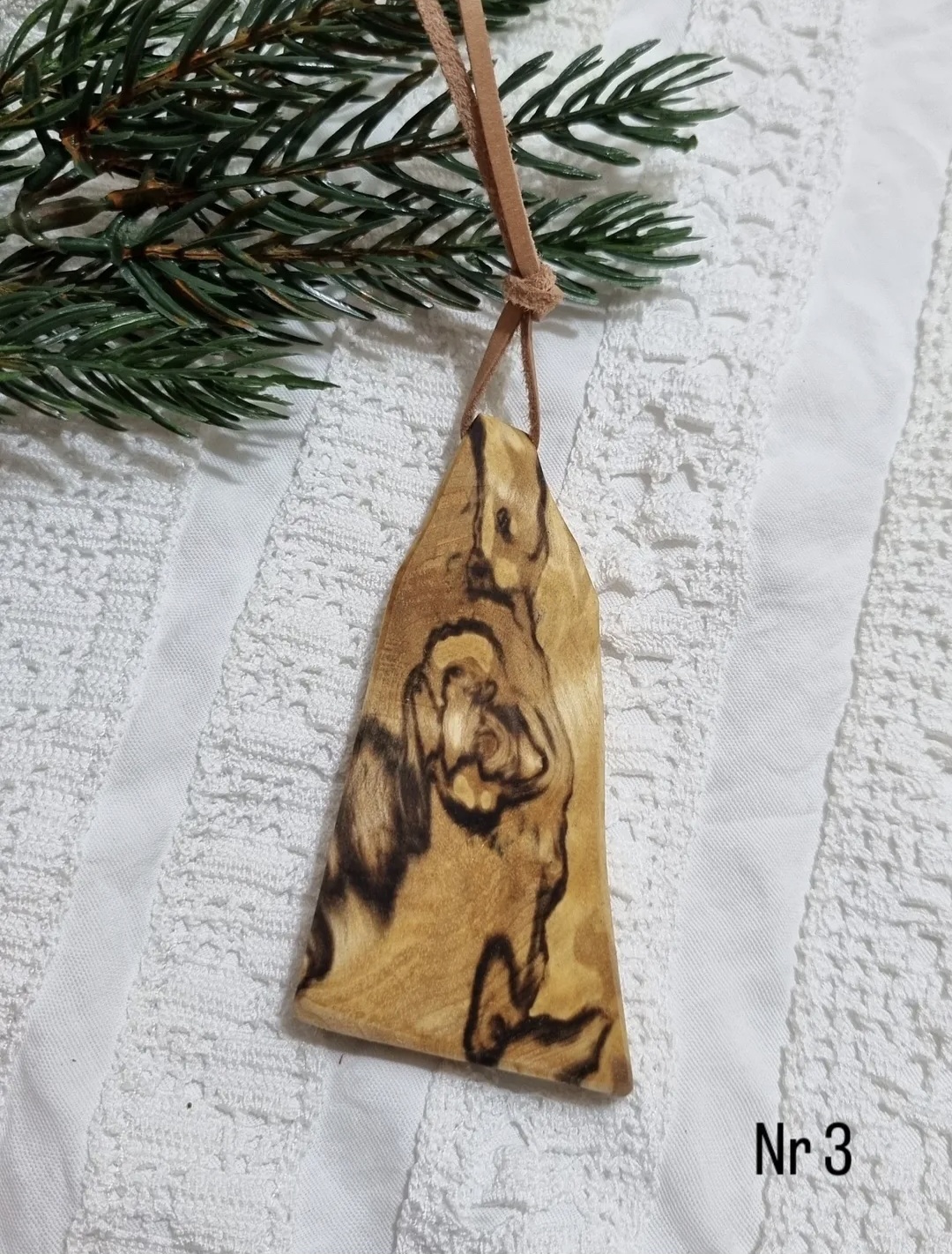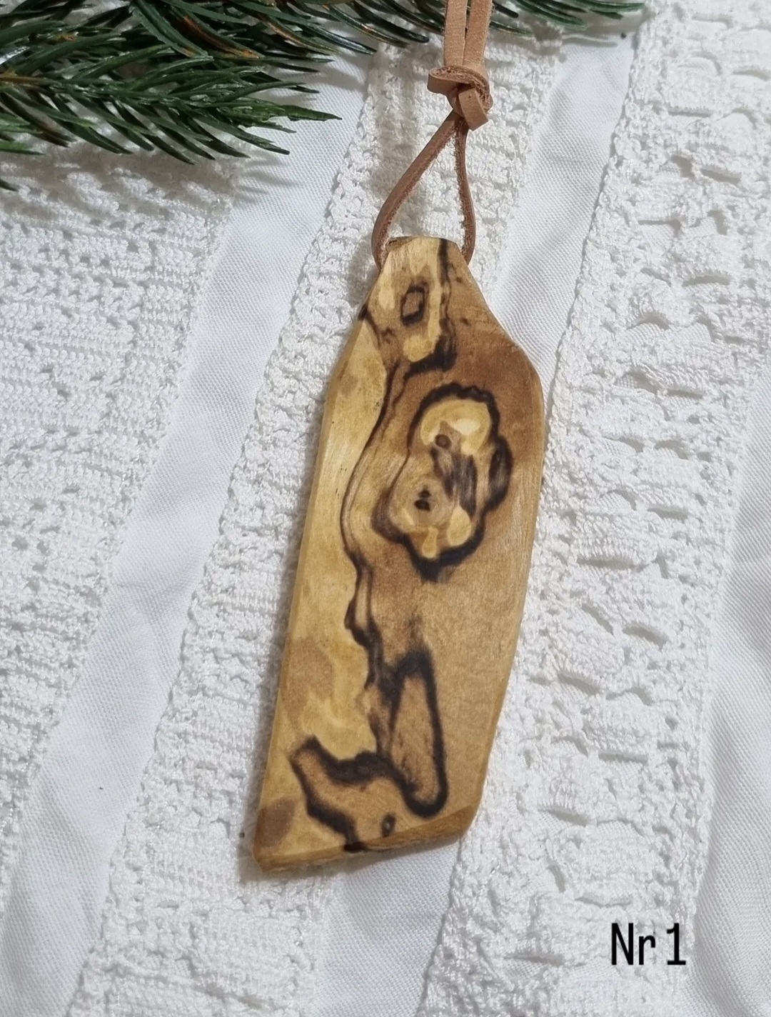Halsband med läderrem, ca 8 x 3 cm. Träkonst tillverkad som en hyllning till naturens eget skapande. Handgjord med kärlek av min pappa Bo, ur masurbjörk som vuxit sig stark under midnattssol och norrsken i Tornedalens skogar.