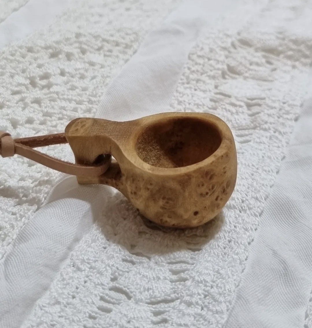 Liten träkåsa (ca 3,5 x 2,5 cm) med läderrem. Handgjord med kärlek av min pappa Bo ur masurbjörk som vuxit sig stark under midnattssol och norrsken i Tornedalens skogar. Levereras slumpmässigt utvald!